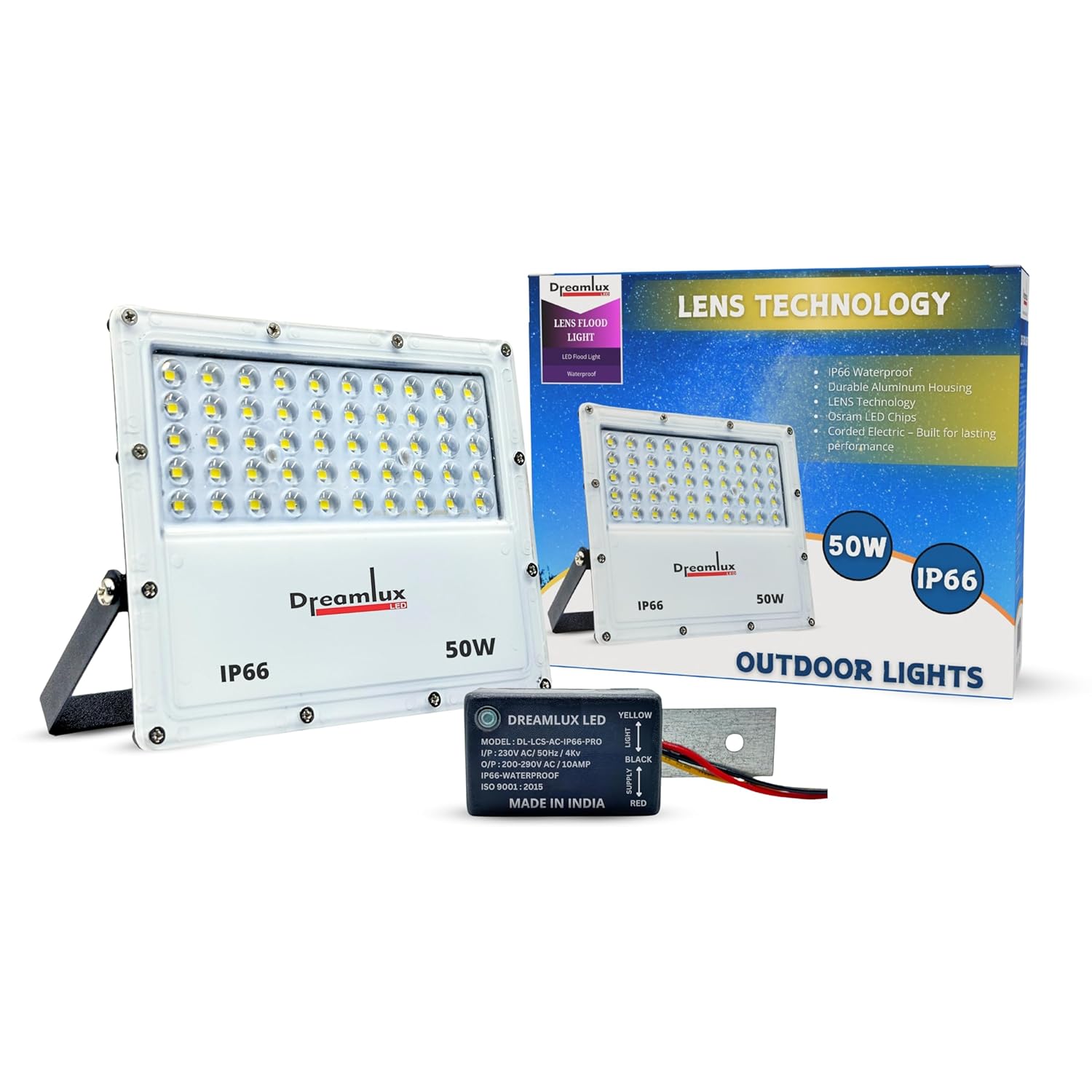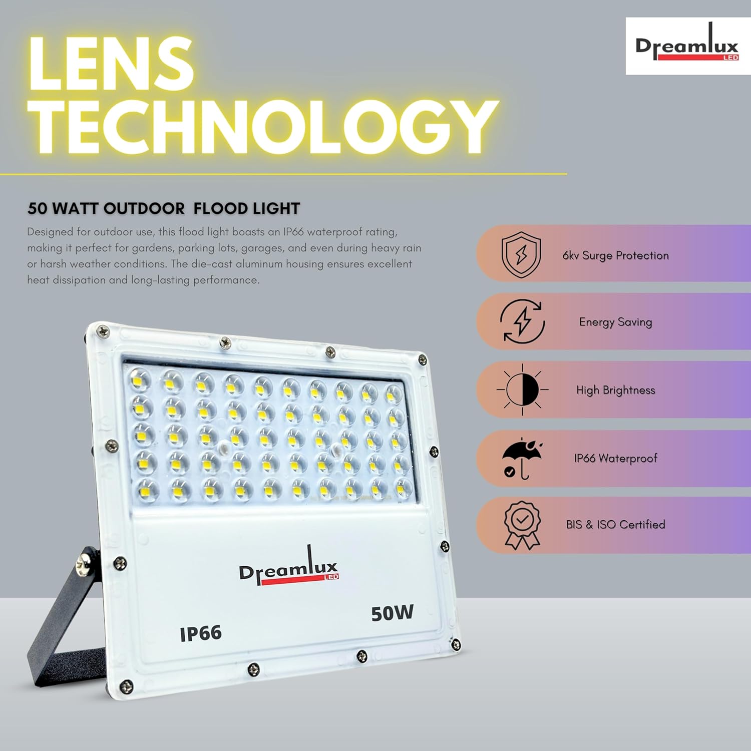 Dreamlux 50W Dusk to Dawn LED Flood Light with Lens Technology | Auto ON/OFF Outdoor IP66 Waterproof Light, BIS Approved, 140-150lm/W, Outdoor Focus Light for Garden, Garage, Street-Cool White