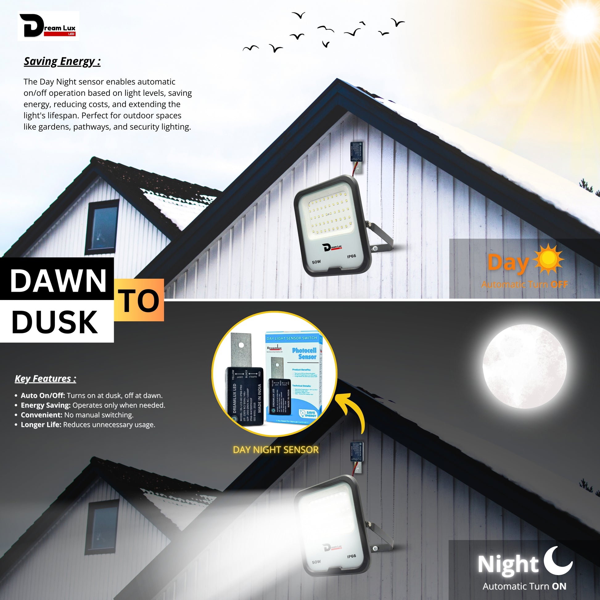Dreamlux 50W LED Flood Light with Dusk to Dawn Sensor | Cool White 6500K | Automatic Day-Night On/Off | IP66 Waterproof, 6Kv Surge Protection Focus Light for Garden & Shop (50W, LDR Sensor)